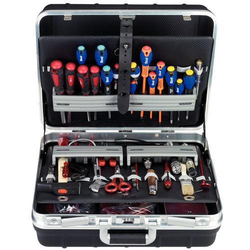 - In mobile con contenitore modulare. Questa selezione generale offre 20 strumenti di base in una scatola di plastica. Volume disponibile per strumenti aggiuntivi. Dimensioni: 650 x 268 x 273 mm. Peso: 9,300 kg.