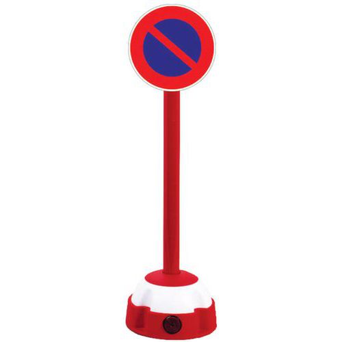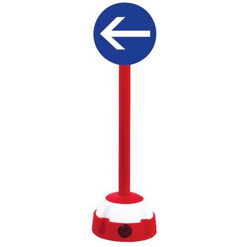 Paletto in alluminio con fascetta di collegamento per il fissaggio di un pannello di segnalazione. Base bicolore zavorrabile fino a 13 kg o da fissare al suolo e dotata di due catadiottri per la visibilità notturna.