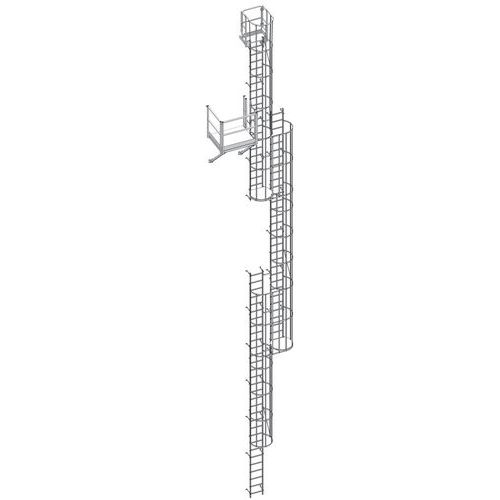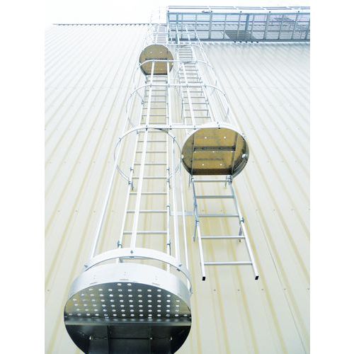 Scala con gabbia di protezione adattabile a tutte le sagome degli edifici. Lega di alluminio: ottimo rapporto portata/peso. Assemblaggio e posa in opera semplici e rapidi. Anticorrosione, facilità di manutenzione. Scala con intervallo tra le barre 280 mm . Uscita frontale con gabbia, larghezza 1300 mm.