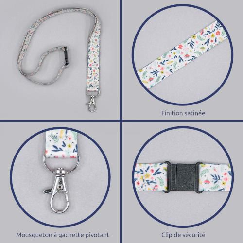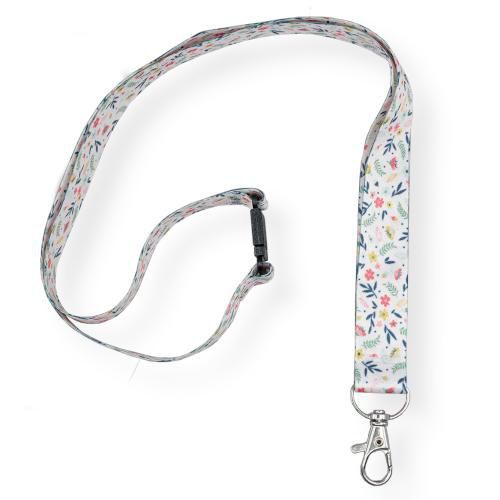 Laccetto Avery satinato, largo e piatto, morbido al tatto e comodo da indossare. Moschettone standard girevole. La clip di sicurezza si stacca in caso di trazione eccessiva per evitare il rischio di strozzamento.