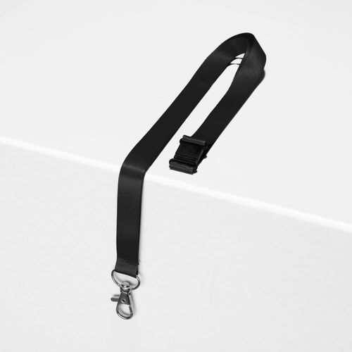 Laccetto realizzato da bottiglie di plastica riciclata. Laccetto in tessuto piatto con finitura satinata, comodo da indossare. Gancio a moschettone girevole in metallo. Clip di sicurezza per aprire il laccetto in caso di tensione eccessiva.