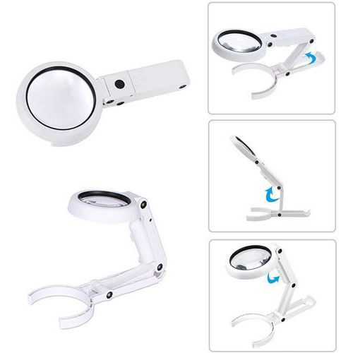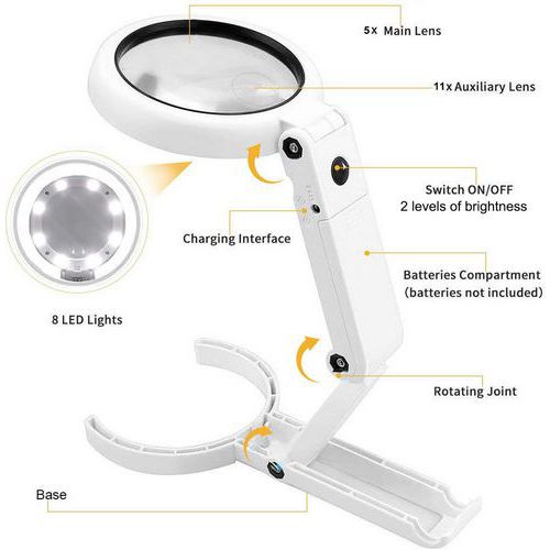 Questa lente può essere utilizzata in due modi: in mano come una normale lente d'ingrandimento oppure allungandola e utilizzandola come lampada da tavolo.