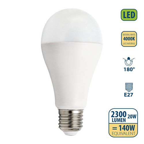 Lampadina a led SMD A65 20 W attacco E27 con durata di 20000 ore (nettamente superiore agli standard del mercato).