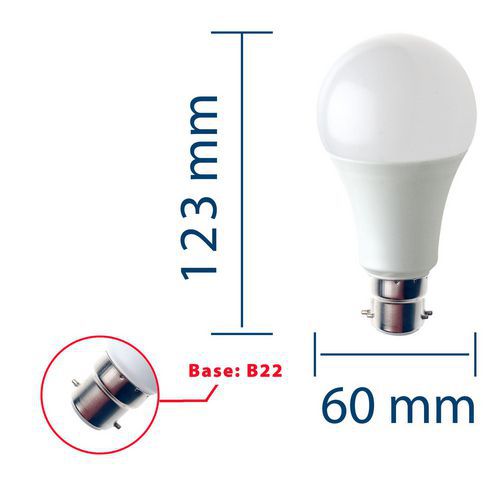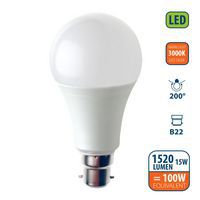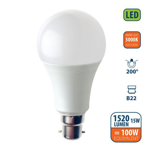 Lampadina a led SMD standard A60 15 W attacco B22 con durata di 20000 ore (nettamente superiore agli standard del mercato).