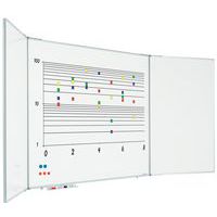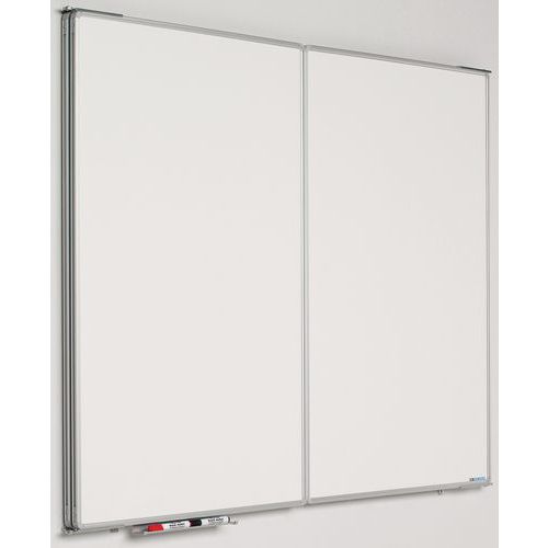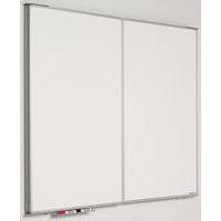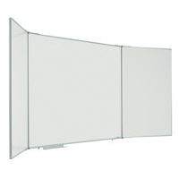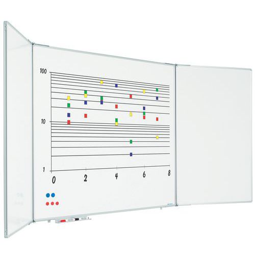 Lavagna bianca dotata di 5 pannelli in acciaio smaltato bianco su cui è possibile scrivere. Pannelli supplementari per aumentare l'area di scrittura. Magnetica e cancellabile a secco. La lavagna intermedia ha un rinforzo supplementare costituito da una piastra posteriore in acciaio galvanizzato. Provvista anche di una vaschetta per riporre i materiali. Alle estremità dei pannelli sono presenti dei magneti per impedirne l'apertura o la chiusura involontaria. Quando sono chiusi, i battenti garantiscono la protezione delle vostre informazioni confidenziali. Dimensioni aperta: 90 x 240 e 120 x 400 cm.