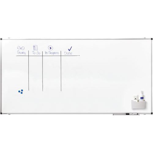 Superficie in acciaio laccato. Superficie scrivibile con pennarelli. Cornice in alluminio con angoli in plastica grigio scuro. Vaschetta portapennarelli da 30 cm. Fissaggio a parete facilitato con fessura nascosta. Opzione di montaggio in orizzontale o in verticale. Fornita con materiale di montaggio, vaschetta e marcatori.