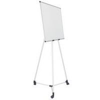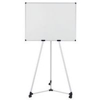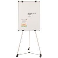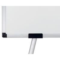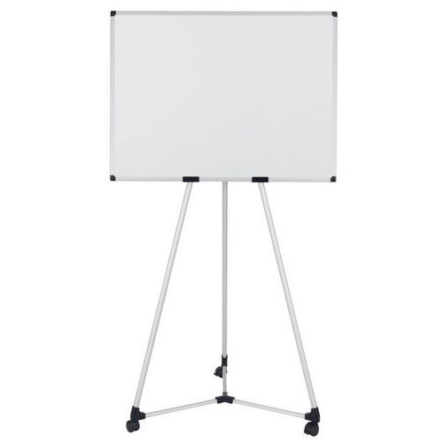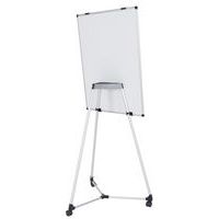 Lavagna bianca magnetica 100x70cm, treppiedi in alluminio, base centrale in plastica che funge anche da portaoggetti per conservare accessori, ganci per i blocchi di carta, kit mobile e istruzioni di montaggio.