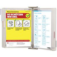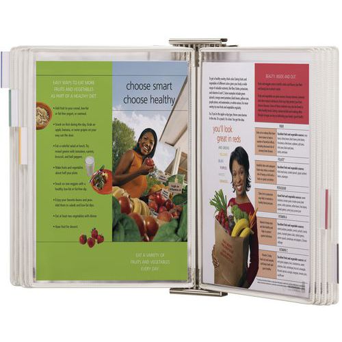 Composizione: - 1 elemento da parete (grigio chiaro o inox) - 10 buste con perno girevole - 5 linguette di classificazione (inserti trasparenti/colorati) - Fissaggio su parete (viti, tasselli e distanziali)