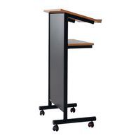 Leggio mobile in acciaio con parte frontale solida e ripiano supplementare. Leggio modello chiuso: parte frontale chiusa. Ripiano superiore inclinato. Ripiani in legno. Montato su 4 rotelle con freno.
