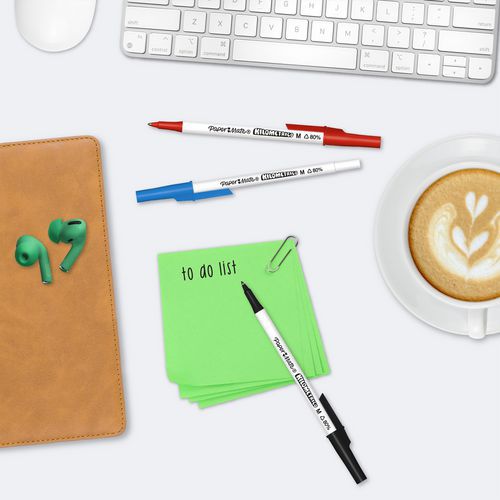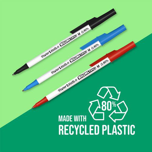 Realizzate per l'80% in plastica riciclata, le penne a sfera Paper Mate® Kilometrico garantiscono una scrittura affidabile e fluida, indipendentemente dalla situazione. Disponibili con inchiostro nero, blu, rosso e una punta media da 1,0 mm per un aspetto robusto e professionale.