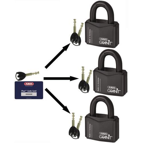 Lucchetto fornito con 2 chiavi singole. Questo lucchetto deve essere ordinato con la chiave passe-partout per lucchetto Granit serie 37 e 88. Per ordinare un'ulteriore chiave passe-partout supplementare, indicare il numero della chiave passe-partout già in possesso (7 cifre).