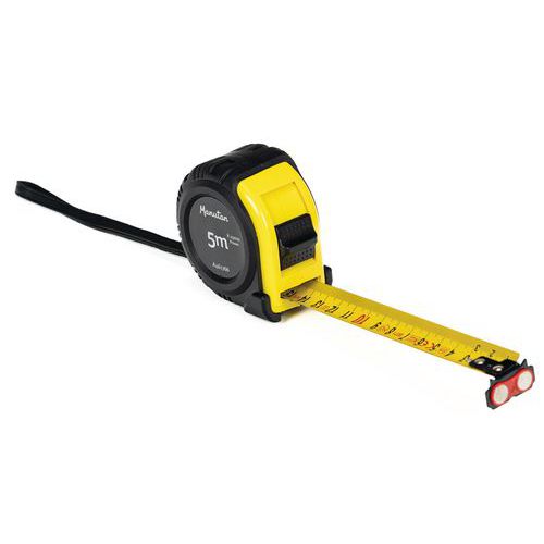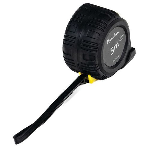 Metro a nastro 5x25 mm, in ABS ergonomico con linguetta di sicurezza. Con lama rigida doppia ad alta resistenza in nylon (nylon wrap). Ritorno rapido tramite molla robusta.