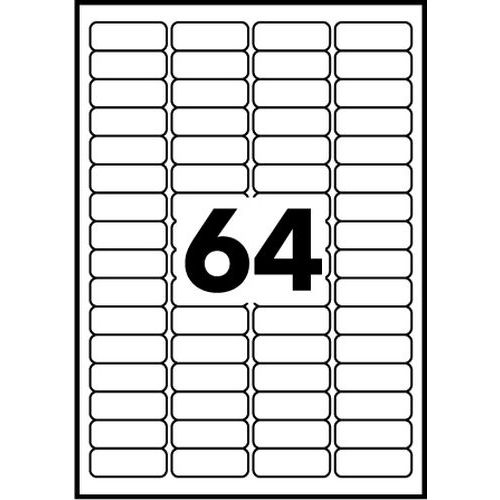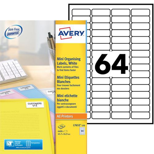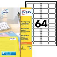 Mini-etichetta Avery, N. di etichette/foglio: 64, N. di etichette: 6400, Lunghezza Etichetta: 45.7 mm Mini-etichetta Avery, N. di etichette/foglio: 64, N. di etichette: 6400, Lunghezza Etichetta: 45.7 mm