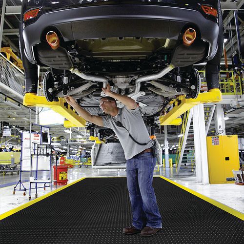 Sistema di tappeti antifatica per un uso intensivo con il massimo comfort, con superficie in lamiera diamantata, facile assemblaggio per coprire grandi aree o creare postazioni individuali. Questi moduli componibili da 45 cm x 45 cm in gomma sono ideati con un doppio sistema di collegamento universale sui 4 lati per garantire una combinazione robusta, perfetta e facile da installare. I tappeti con spessore di 19 mm isolano l'operatore dal pavimento duro e le cupole a bolle sotto la suola permettono il piegamento e la flessione del tappeto ad ogni movimento. I bordi prevengono i rischi di cadute e inciampo e consentono il facile accesso dei carrelli. Soluzione per angoli interni ed esterni.