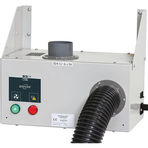 Per armadi di sicurezza sottobanco Modulo di aspirazione per montaggio a parete con dispositivo di controllo dell'aria di scarico I vapori e i gas devono essere catturati secondo le norme, nel loro punto di emissione Silenziatore per installazione diretta sul posto di lavoro Dotato di collegamento e cavo di alimentazione connettore DN 75 Conformità ATEX C II 3/-G Ex c llC T4 , CE Dispositivo di monitoraggio dell'evacuazione dell'aria Scatola di regolazione della pressione integrata In caso di malfunzionamento del ventilatore, la spia si accende Montaggio a parete, incl. staffe a parete, tubo flessibile, fascette stringitubo, materiale di fissaggio