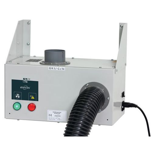 Per armadi di sicurezza sottobanco Modulo di aspirazione per montaggio a parete con dispositivo di controllo dell'aria di scarico I vapori e i gas devono essere catturati secondo le norme, nel loro punto di emissione Silenziatore per installazione diretta sul posto di lavoro Dotato di collegamento e cavo di alimentazione connettore DN 75 Conformità ATEX C II 3/-G Ex c llC T4 , CE Dispositivo di monitoraggio dell'evacuazione dell'aria Scatola di regolazione della pressione integrata In caso di malfunzionamento del ventilatore, la spia si accende Montaggio a parete, incl. staffe a parete, tubo flessibile, fascette stringitubo, materiale di fissaggio