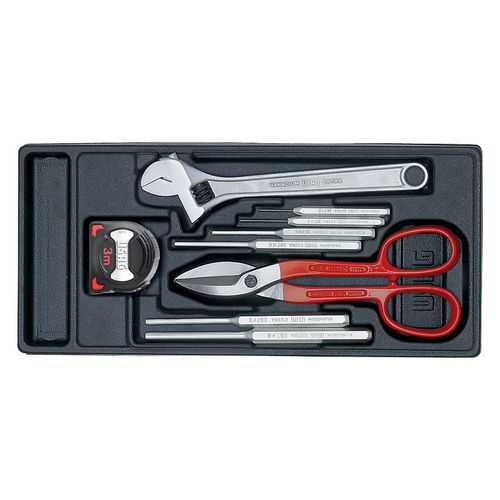 | Dati tecnici | Fornito di 1 cesoia per lamiere, 1 flessometro professionale con rivestimento antiurto, 1 chiave a rullino con regolazione rapida e 6 cacciaspine. |