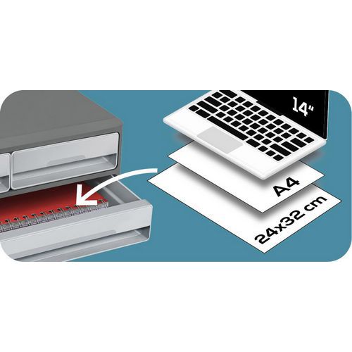1 cassetto grande per documenti fino al formato 24x32 cm, ripiano e computer portatile fino a 14.