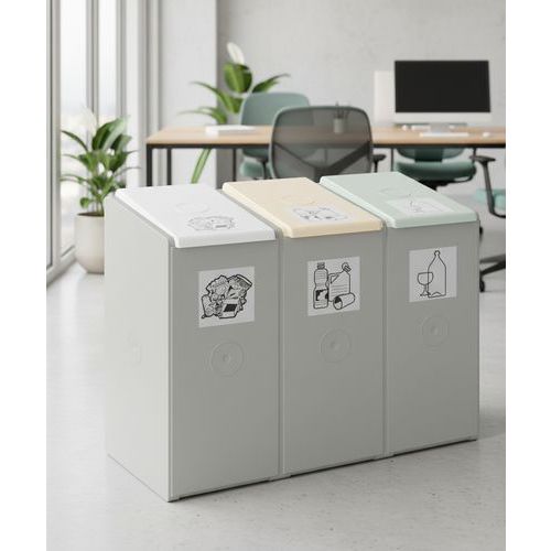 Modulo di riciclaggio in plastica. Per creare uno spazio per la raccolta differenziata con coperchi di colori differenti. Configurazione in base alle vostre esigenze. Questi moduli offrono una disposizione elegante.