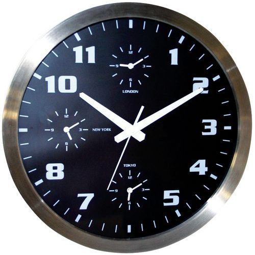 | Descrizione | Orologio parete con 4 fusi orari, Scatola materiale: Inox, Ø: 40 cm, Tipo: Analogico, Colore: Grigio |
