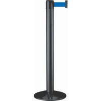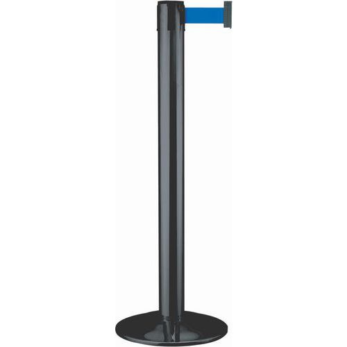 Paletto con nastro dalla massima stabilità. Nastro retrattile autofrenato: si riarrotola delicatamente in caso di sganciamento. Dotato di 1 elemento di partenza e 3 punti di aggancio. Base in ghisa con protezione in gomma antitraccia.