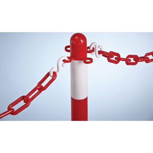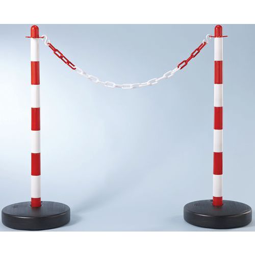 Paletto in plastica con punti di aggancio sulla parte superiore che consentono di attaccare qualsiasi tipo di catena. La base può essere facilmente zavorrata con sabbia.