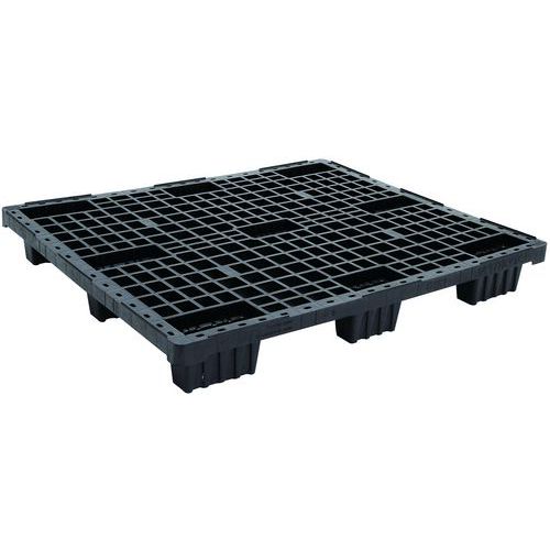 Pallet per impieghi leggeri 800x600mm, 1200x800 mm e 1200x1000mm neri con pianale pieno o traforato e bordo di sicurezza interrotto da 5 mm. I pallet sono leggeri, robusti e impilabili.