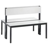 Panca appendiabiti bifrontale con schienale, struttura solida, con o senza griglia porta-scarpe a seconda del modello. Finitura elegante con rivestimento in legno massiccio: doppia seduta e schienale HPL, alta resistenza all'umidità. Panca con piedini con gommini per la protezione dei pavimenti, regolabili per la compensazione perfetta dell'altezza (10 mm). Struttura tubolare in acciaio con sezione 30 x 30 mm. Rivestimento della seduta HPL con spessore 13 mm. Modello con griglia porta-scarpe: telaio zincato per elettrolisi. Realizzato in Germania