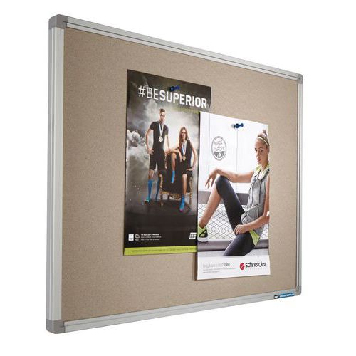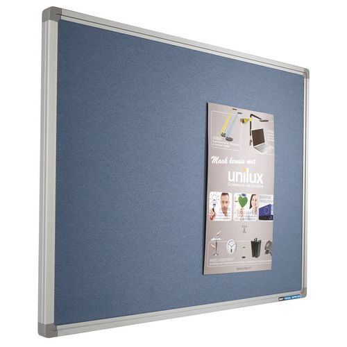 Lavagna di affissione in tessuto per puntine. Superficie di alta qualità in materiale 100% riciclato. Fondo in ampia gamma di colori. Materiale in alluminio anodizzato di qualità. Telaio con profili e angoli in plastica. Manutenzione agevole. Resistente al fuoco.