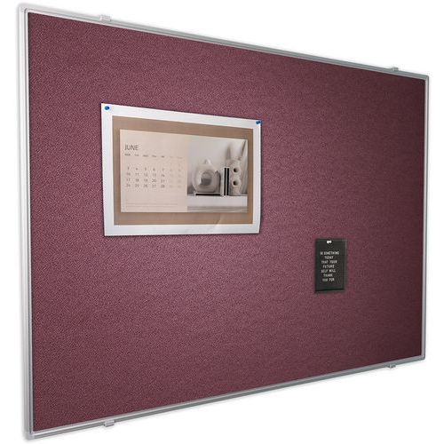 Lavagna di affissione in tessuto per puntine. Superficie di alta qualità in materiale 100% riciclato. Fondo in ampia gamma di colori. Materiale in alluminio anodizzato di qualità. Telaio con profili e angoli in plastica. Manutenzione agevole. Resistente al fuoco.