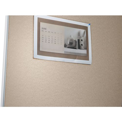 Lavagna di affissione in tessuto per puntine. Superficie di alta qualità in materiale 100% riciclato. Fondo in ampia gamma di colori. Materiale in alluminio anodizzato di qualità. Telaio con profili e angoli in plastica. Manutenzione agevole. Resistente al fuoco.