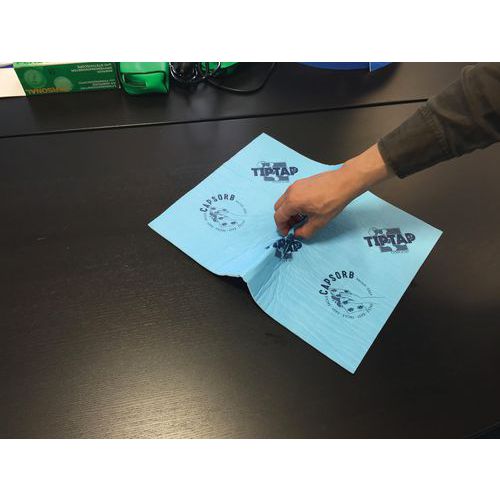 Lo strato superiore funge da barriera protettiva che, grazie a una comoda piega, facilita la rimozione e la gestione del panno bagnato, evitando il contatto con le sostanze assorbite.