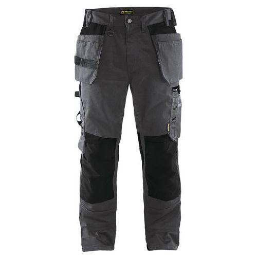 Dettagli: patta con cerniera in plastica Due passeri per cintura sui lati con bottone per il passante porta-martello con anello a D sul davanti Curva della cintura larga sulla posteriore Bottoni en metallo Tripla cucitura sur cavallo Tasca staccabile per badge identificativo Tasche: posteriori rinforzate con soffietto Tasca sulla gamba con soffietto, porta-penna tasca, porta-telefono, due tasche cresciute con chiusura lampo e una tasca per fogli rimovibile Tasca all'americana Tasche porta-ginocchiere Tasche pensili con porta-utensili, che possono essere inserite nelle davanti bag Tasca per metro rinforzata con tasca porta penna Rinforzo: bag posteriori rinforzate Cordura® Bag porta-ginocchiere in tessuto stretch tessuto rinforzato in Cordura®