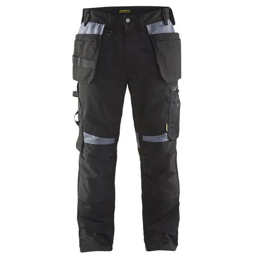 Dettagli: patta con cerniera in plastica Due passeri per cintura sui lati con bottone per il passante porta-martello con anello a D sul davanti Curva della cintura larga sulla posteriore Bottoni en metallo Tripla cucitura sur cavallo Tasca staccabile per badge identificativo Tasche: posteriori rinforzate con soffietto Tasca sulla gamba con soffietto, porta-penna tasca, porta-telefono, due tasche cresciute con chiusura lampo e una tasca per fogli rimovibile Tasca all'americana Tasche porta-ginocchiere Tasche pensili con porta-utensili, che possono essere inserite nelle davanti bag Tasca per metro rinforzata con tasca porta penna Rinforzo: bag posteriori rinforzate Cordura® Bag porta-ginocchiere in tessuto stretch tessuto rinforzato in Cordura®