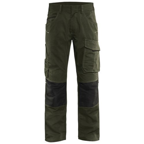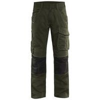 Pantaloni da lavoro in tessuto stretch verde oliva/nero, dettagli catarifrangenti Pantaloni da lavoro in tessuto stretch verde oliva/nero, dettagli catarifrangenti