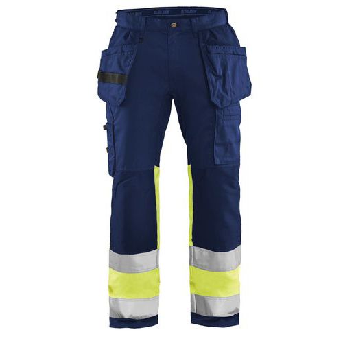 Pantaloni per artigiano stretch ad alta visibilità blu marino/giallo fluorescente con tasche e cintura