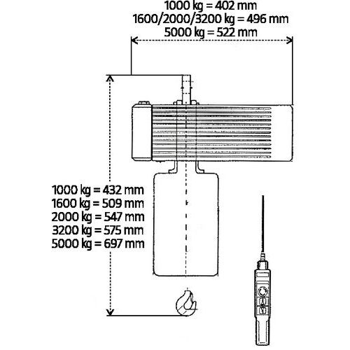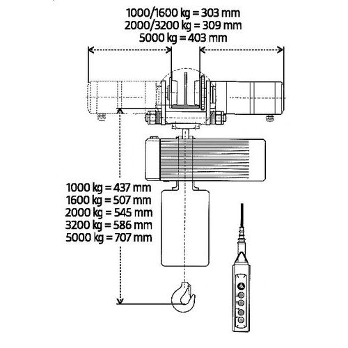 Lunghezza massima della catena 25 m, catena più lunga su richiesta. Disponibili separatamente: alimentazione 230 V trifase per paranco o per paranco con carrello.