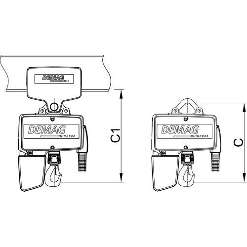 Versione fissa per il fissaggio a un gancio. Disponibile su richiesta: paranchi elettrici per ambienti umidi o per l'esterno, altra tensione trifase, altezze di sollevamento superiori a 8 metri, altre velocità, altri gruppi FEM, per carichi medi o carichi superiori a 2 tonnellate e per carrelli adatti ai tracciati curvi.