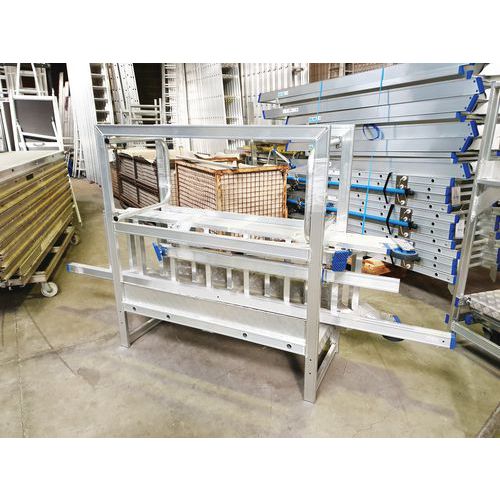 Passerella robusta in alluminio per lavori in altezza in estrema sicurezza. Ultra stabile grazie a due stabilizzatori regolabili muniti di piedi girevoli. Ingombro ridotto con parti della scaletta smontabili (parapetto fisso).