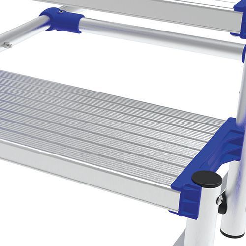 Passerella in alluminio fissa a doppio ingresso, altezza di accesso ridotta. Sicura: 2 parapetti integrati per una maggiore sicurezza anticaduta. Stabile con piattaforma ampia e gradini profondi antiscivolo. Passerella fissabile al suolo secondo necessità tramite piedi ampi a doppio fissaggio. Confortevole, modulare, polivalente, per qualsiasi esigenza. Struttura molto resistente, adatta a un uso intensivo, per superfici piane. Piede a doppio fissaggio, viti Ø 8 mm (non fornite). Parapetto con zoccolo integrato (h 100 mm).