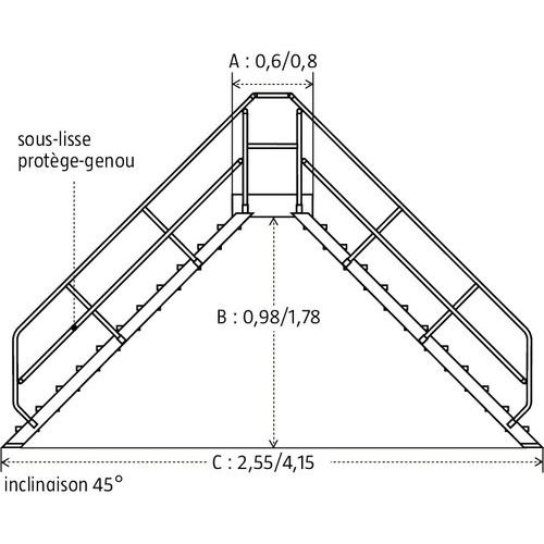 Barra di rinforzo sotto la piattaforma per una migliore mobilità. Passerella con 2 corrimani. Gradini avvitati ai montanti. Prodotto realizzato in Francia.