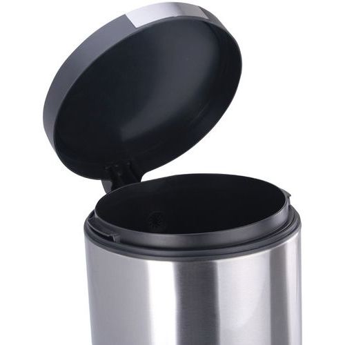 Pattumiera rotonda con coperchio in plastica e pedale rialzato in acciaio inox. Cestino interno in plastica e chiusura silenziosa.