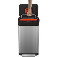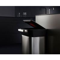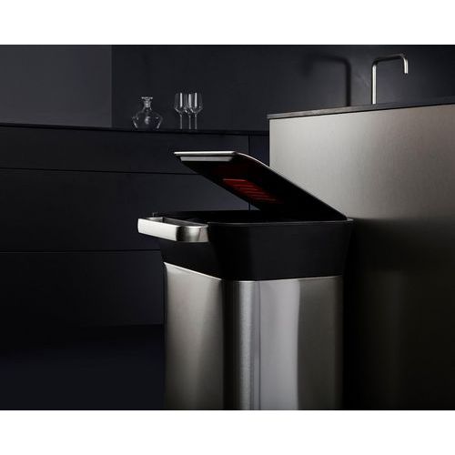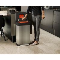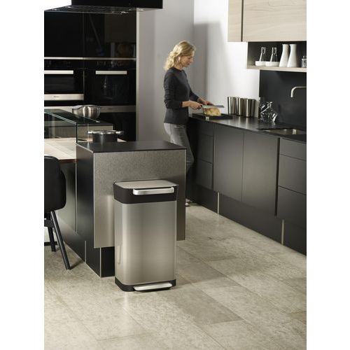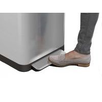 Pattumiera a pedale elegante con compattatore rifiuti integrato per comprimere i rifiuti all'interno della pattumiera.
