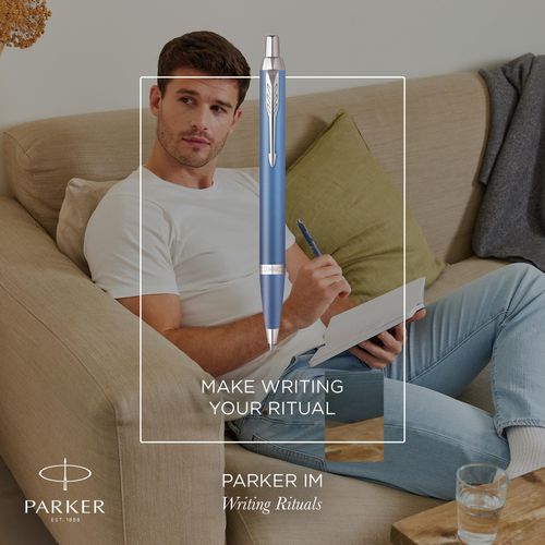 La collezione di penne Parker IM Writing Rituals è stata progettata pensando alle routine di benessere dello scrittore. Il peso, l'estetica, la sensazione di maneggevolezza e l'erogazione fluida dell'inchiostro creano un elemento di lusso e favoriscono la concentrazione durante la scrittura. La delicata sfumatura blu e la finitura metallizzata satinata offrono un perfetto equilibrio con i dettagli cromati. Prendendo ispirazione dalla teoria dei colori, ogni colore è stato selezionato per la sua natura calmante, ispiratrice o edificante. La Parker IM Writing Rituals si presenta con una custodia raffinata, accompagnata da un manicotto assortito.