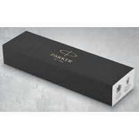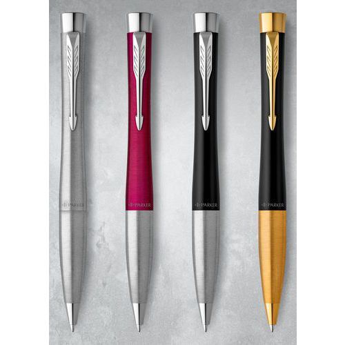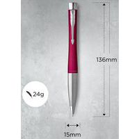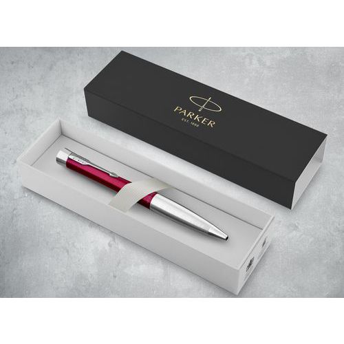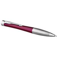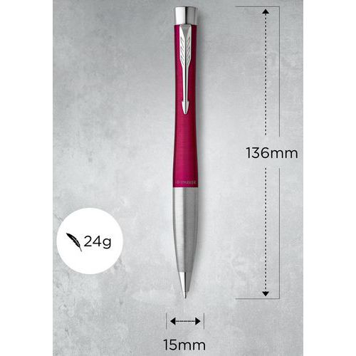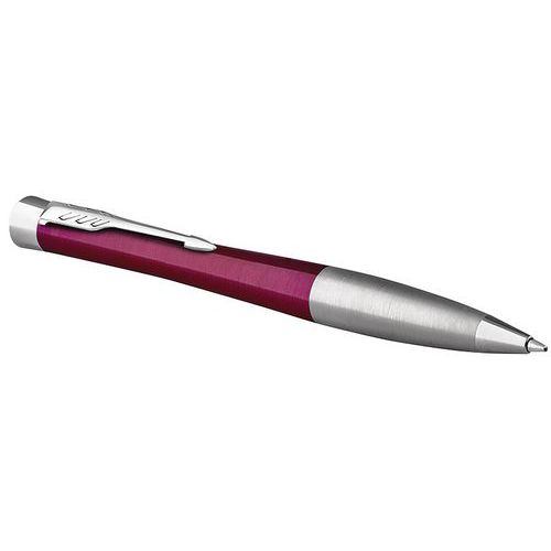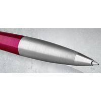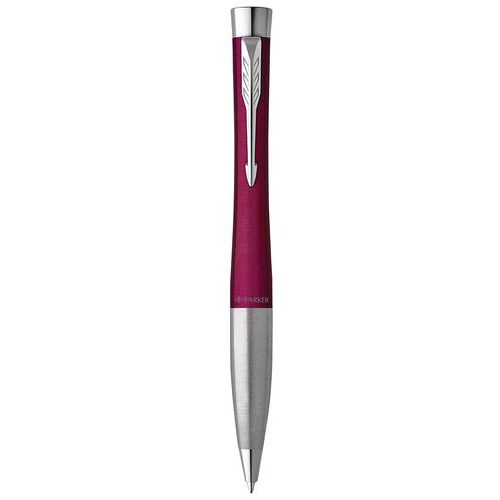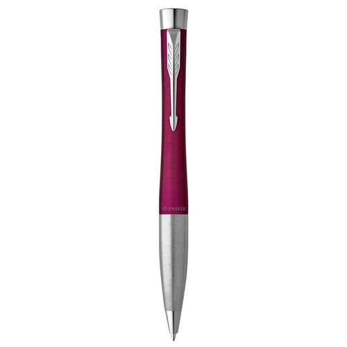 La finitura laccata brillante in magenta è completata da inserti e da un cilindro cromati e dalla tipica clip a freccia della Parker.
