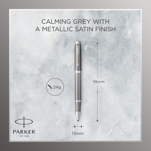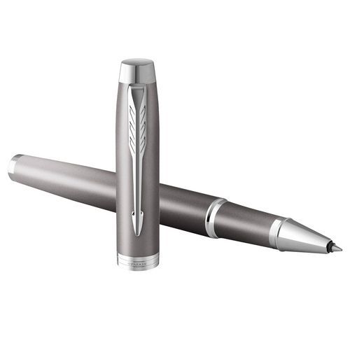 Penna roller Parker IM Writing Rituals Gris con sfumature di grigio. Finitura cromata, punta fine, inchiostro nero.