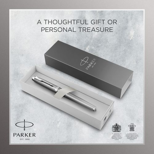 Questo modello Parker IM è offerto in un astuccio regalo con fermaglio impreziosito dal famoso motivo a freccia.