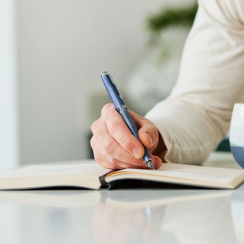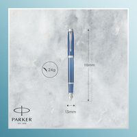 La collezione di penne Parker IM Writing Rituals è stata progettata pensando alle routine di benessere dello scrittore. Il peso, l'estetica, la sensazione di maneggevolezza e l'erogazione fluida dell'inchiostro creano un elemento di lusso e favoriscono la concentrazione durante la scrittura. L'effetto sfumato blu e la finitura metallizzata satinata offrono un perfetto equilibrio con i dettagli cromati. Prendendo ispirazione dalla teoria dei colori, ogni colore è stato selezionato per la sua natura calmante, ispiratrice o edificante. La Parker IM Writing Rituals si presenta con una custodia raffinata e un manicotto in colori assortiti. Questa penna stilografica moderna si utilizza con cartucce d'inchiostro Quink o un flacone d'inchiostro grazie al convertitore. Consente una scrittura ancora più sofisticata.