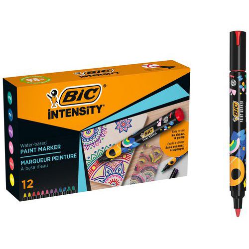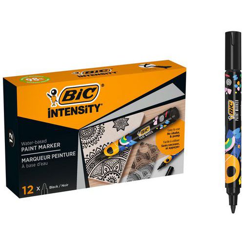 Pennarello a vernice Bic Intensity, per scrittura su più superfici, a lunga durata, le grandi dimensioni del serbatoio garantiscono un utilizzo prolungato. Aggiungete dei colori vivaci ai vostri progetti di bricolage con pennarelli a vernice Bic Intensity. Nessun bisogno di scuotere o premere il pennarello per un'applicazione rapida e facile. Lotto di 12 pennarelli a vernice neri non tossici realizzati con il 98% di materiali riciclati (eccetto il sistema di inchiostro). Buona copertura, l'inchiostro acrilico a base d'acqua copre bene le superfici traslucide e opache.
