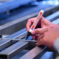 Pennarello a vernice - Edding 750 per una scrittura molto coprente e permanente anche su materiali scuri e trasparenti. Marcatura su metallo, vetro, plastica ecc.. e in particolare su tutte le superfici lisce. Asciugatura rapida della vernice e lieve odore. Resistente all'acqua, alla luce, al calore fino a 400°C (1000°C per alcuni colori come bianco, giallo, argento) e resistente all'abrasione. Erogazione dell'inchiostro controllata da valvola. Senza toluene/xilene.